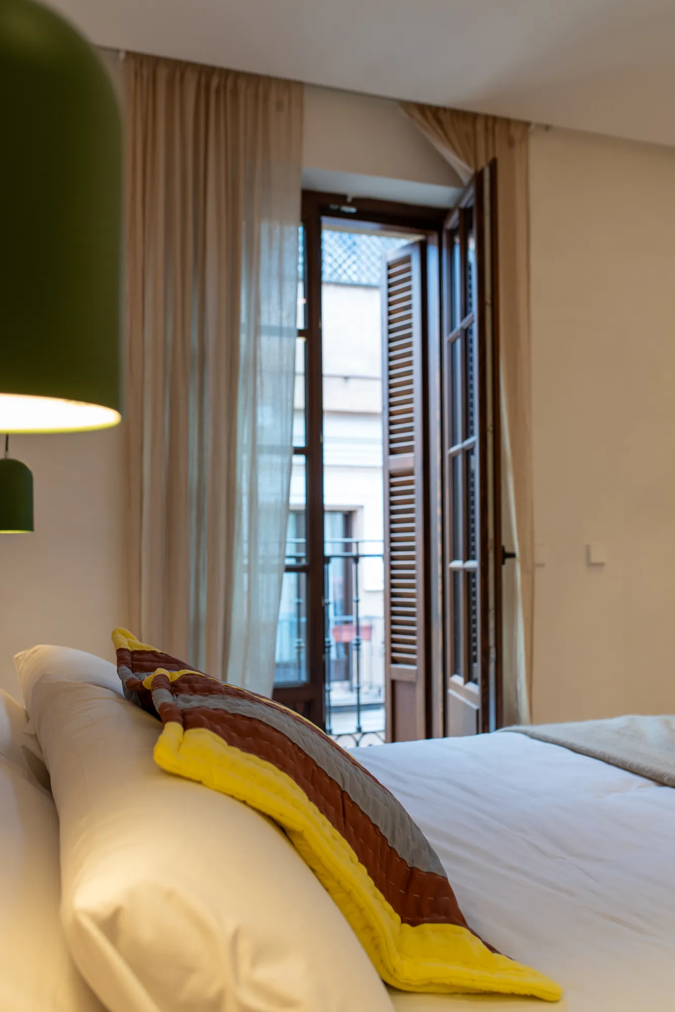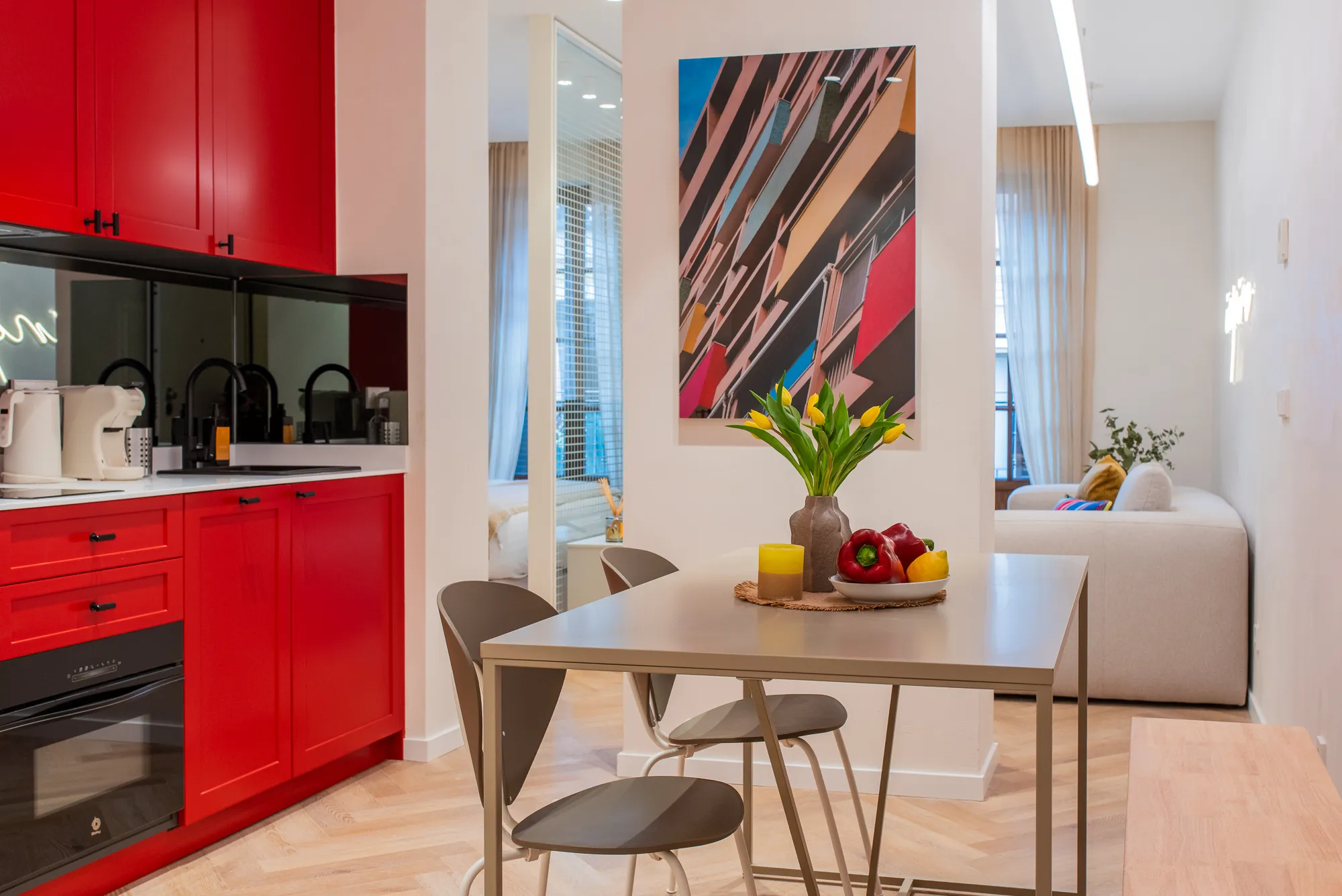 An elegant, light-filled apartment where the living and sleeping areas face one another, connected by a flowing open layout. Two balconies let in morning and afternoon light. This unit offers a comfortable layout with soft tones, modern décor, and a functional kitchen. Two balconies flood the apartment with natural light, perfect for those who want a peaceful retreat after exploring the neighborhood.
